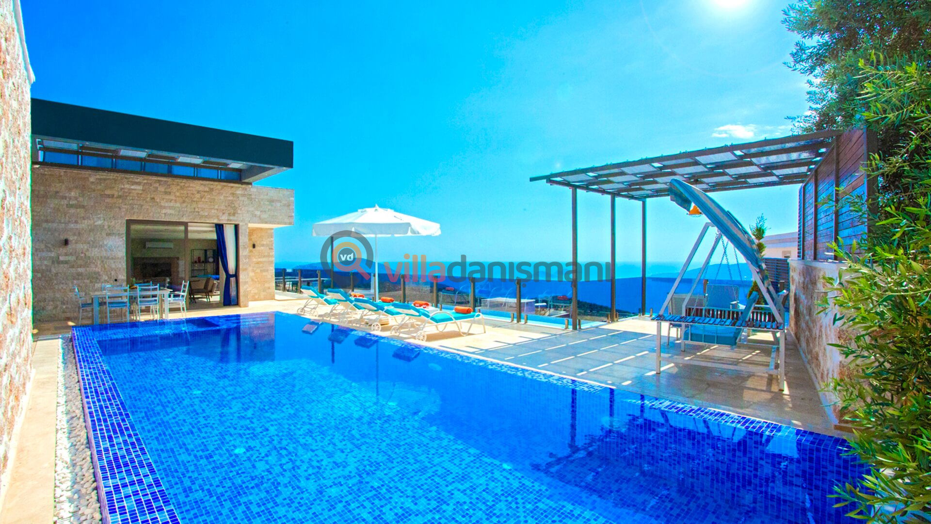 Antalya'nın eşsiz tatil beldelerinden birisi olan Kalkan Merkez mevkiinde bulunan 6 kişi kapasiteli villalarımızdan bir tanesidir. Huzuru ve mutluluğu yaşayacağınız deniz manzaralı aileniz ve arkadaşlarınız ile keyifli bir tatil geçireceğiniz sonsuzluk havuzunda tatilin tadına doyamayacağınız muhteşem bir villamızdır.