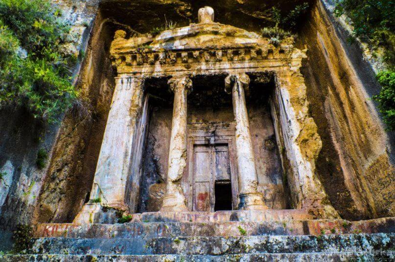Thelmessos M.Ö. 5. Yüzyılda liman kenti olarak kuruldu. Kazılar sonucu amfi tiyatro, kaya ve lahit mezarları bulunmuştur. En sağlam kalıntılar Kral AmyntasKaya Mezarlarıdır. Kral mezarları da olarak bilinen bu yer dağların içine oyulmuş soylu kişilerin mezarlarıdır. Müze kartı ile girip merdivenlerden oluşan dik yamacı tırmandıktan sonra tarihin içine giriş yapıyorsunuz. Manzarada mükemmel.