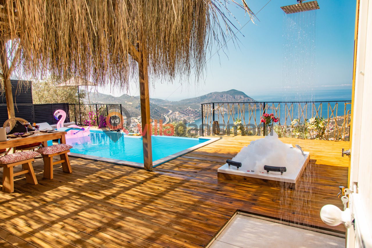 It is a honeymoon villa with a capacity of 2 people, located in the Akbel area of Kalkan, one of the unique holiday resorts of Antalya, in nature and with partial sea view. There is a rotating television unit and a jacuzzi in our villa.
