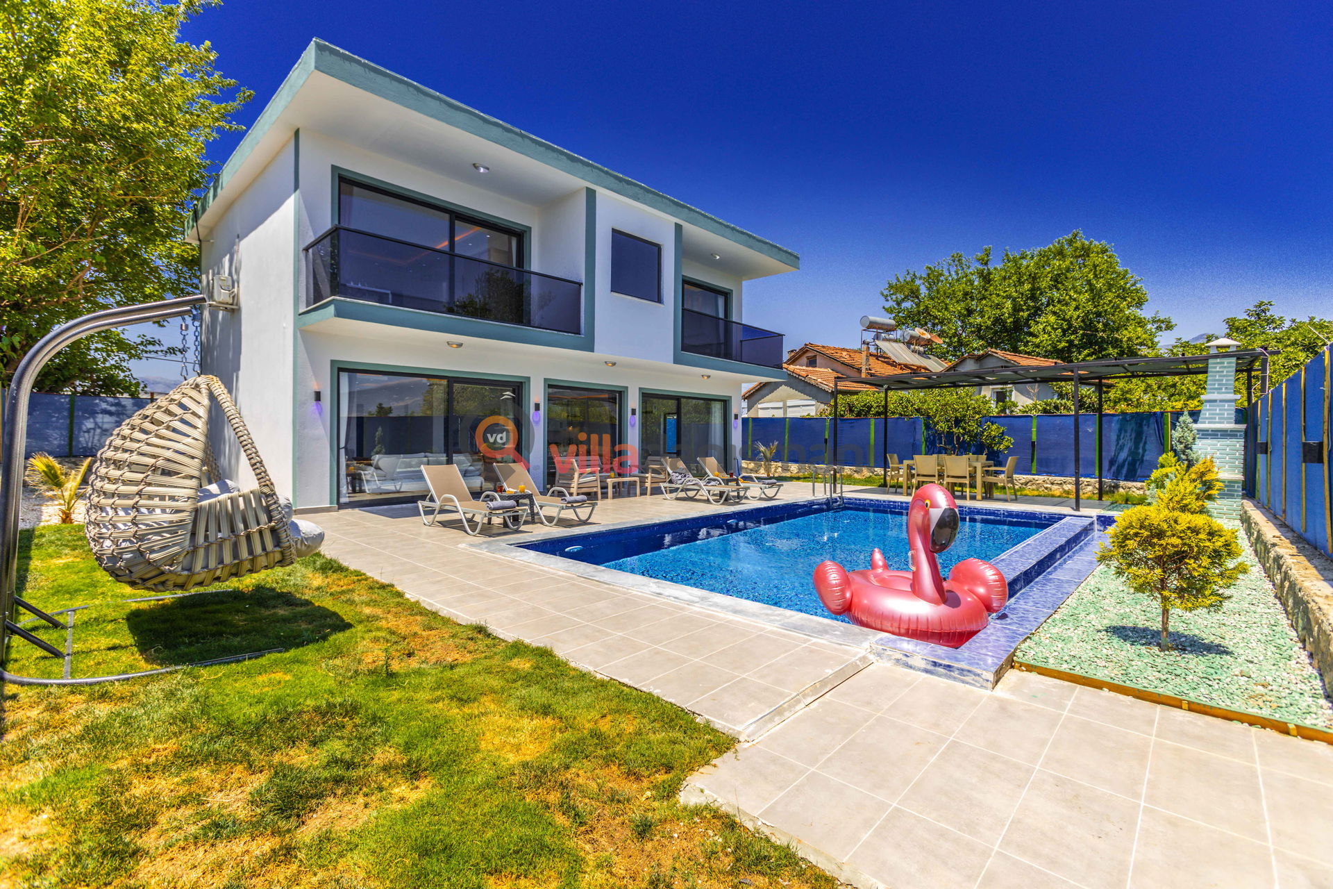 This villa is located Kınık, Kalkan, one of the unique holiday resorts in Antalya, with a capacity of 8 people, 2 bedrooms, a garden and a childrens playing area.