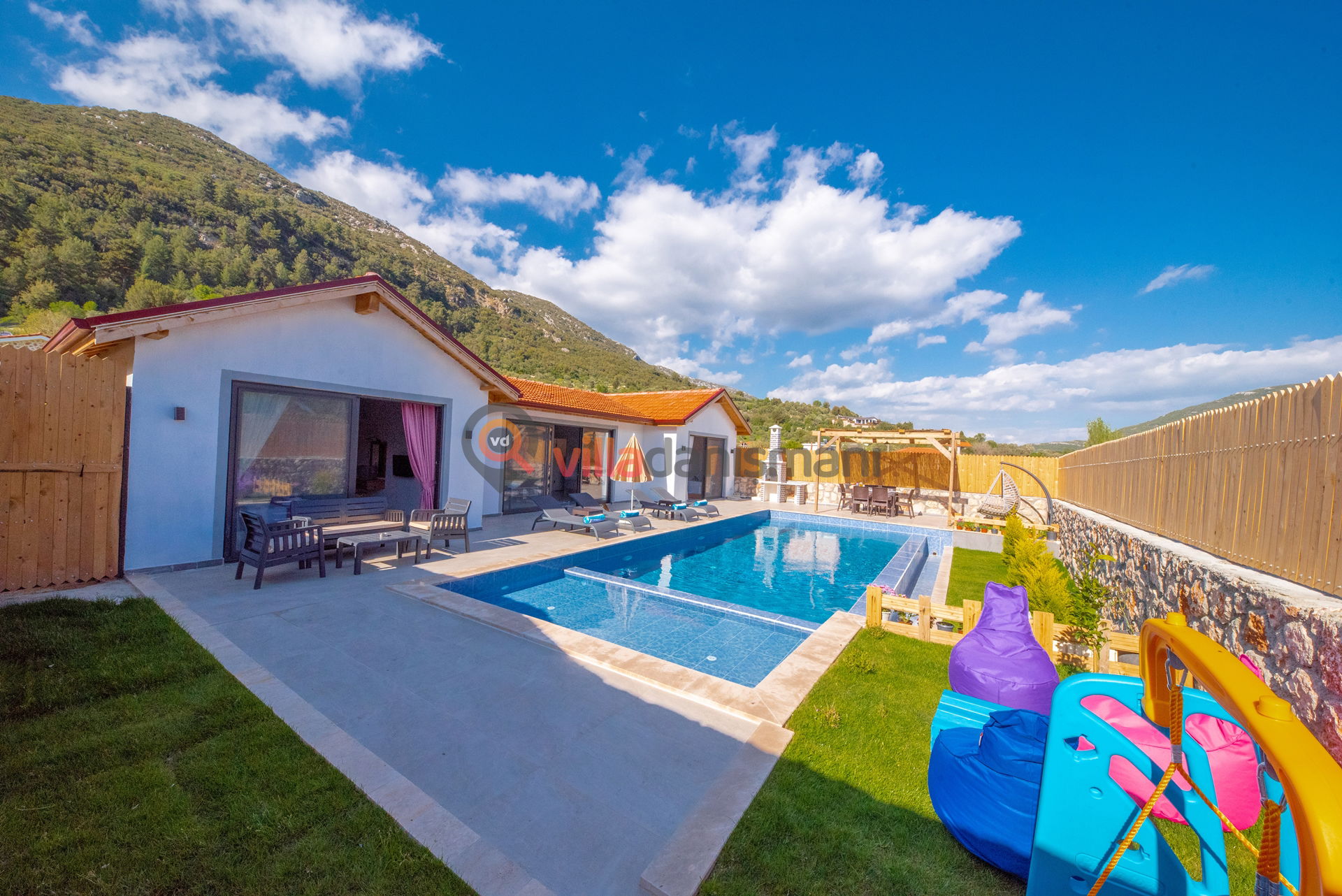Antalya'nın eşsiz tatil beldelerinden birisi olan Kalkan'ın Hacıoğlan mevkiinde da bulunan 4 kişi kapasiteli olup doğa içerisinde, jakuzili, muhafazakar havuz alanına sahip villamızdır.