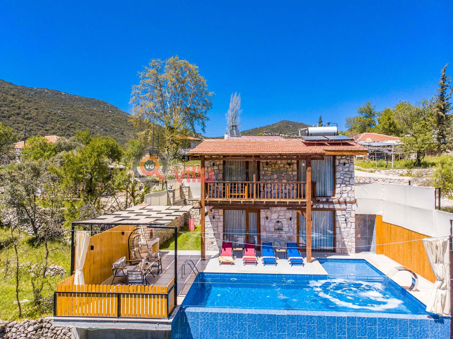 Antalya/Kaş/Kalkan/Sarıbelen’de konumlu Villa Nimet, 2 yatak odalı, 4 kişi konaklama kapasiteli, panoramik deniz manzaralı, korunaklı havuzlu, jakuzili tatil villamızdır.