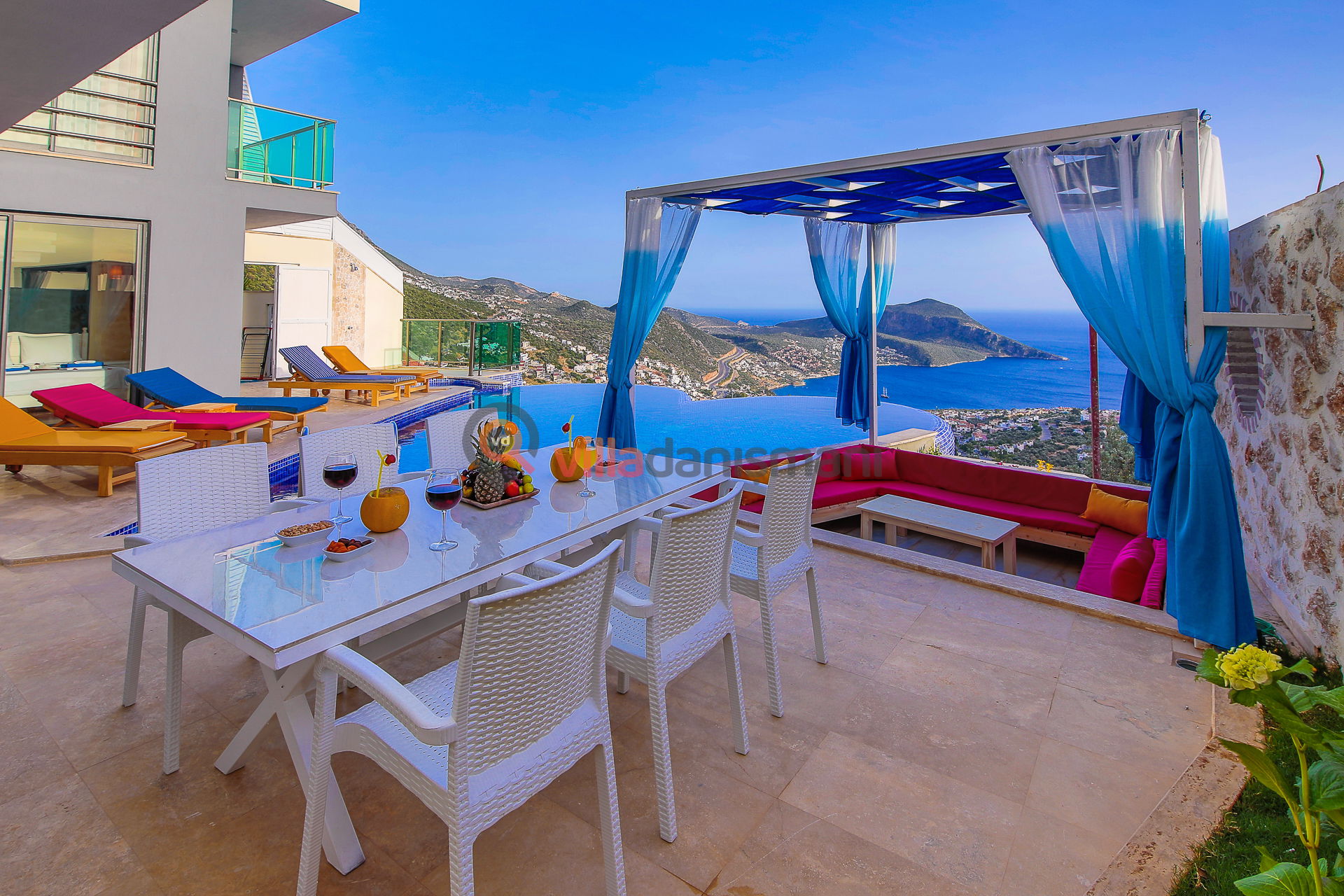 Antalya'nın eşsiz tatil beldelerinden birisi olan Kalkan'ın Akbel mevkiinde bulunan 6 kişi kapasiteli villalarımızdan bir tanesidir. Huzuru ve mutluluğu yaşayacağınız doğa ve deniz manzaralı aileniz ve arkadaşlarınız ile keyifli bir tatil geçireceğiniz sonsuzluk havuzunda tatilin tadına doyamayacağınız muhteşem bir villamızdır.