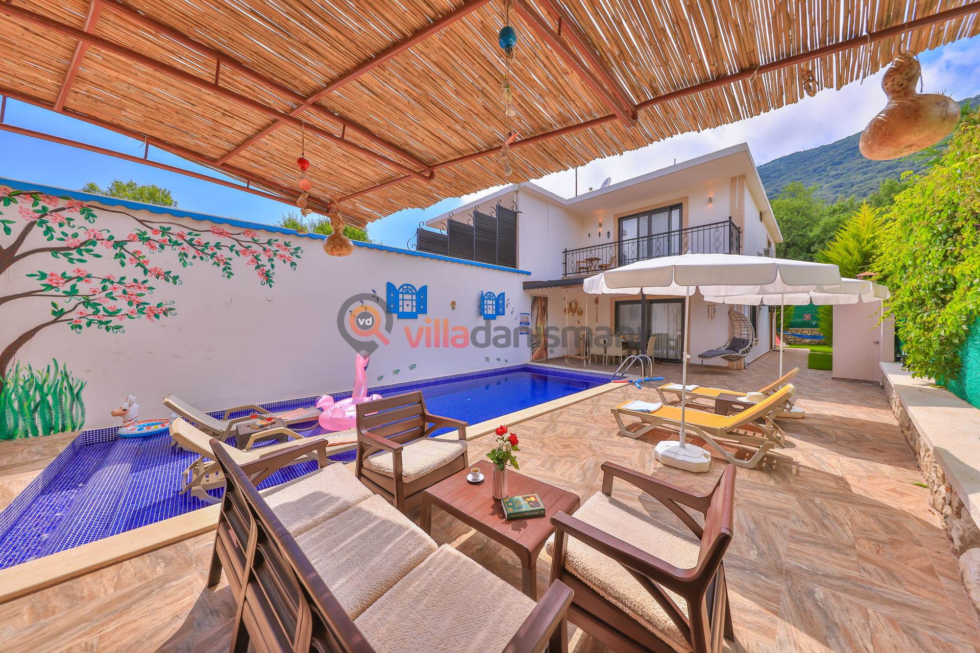 Villamız, 3,5 * 5,3 metre ebatlarında 1,5 metre derinliğinde etrafı korunaklı ısıtmalı havuza sahiptir.